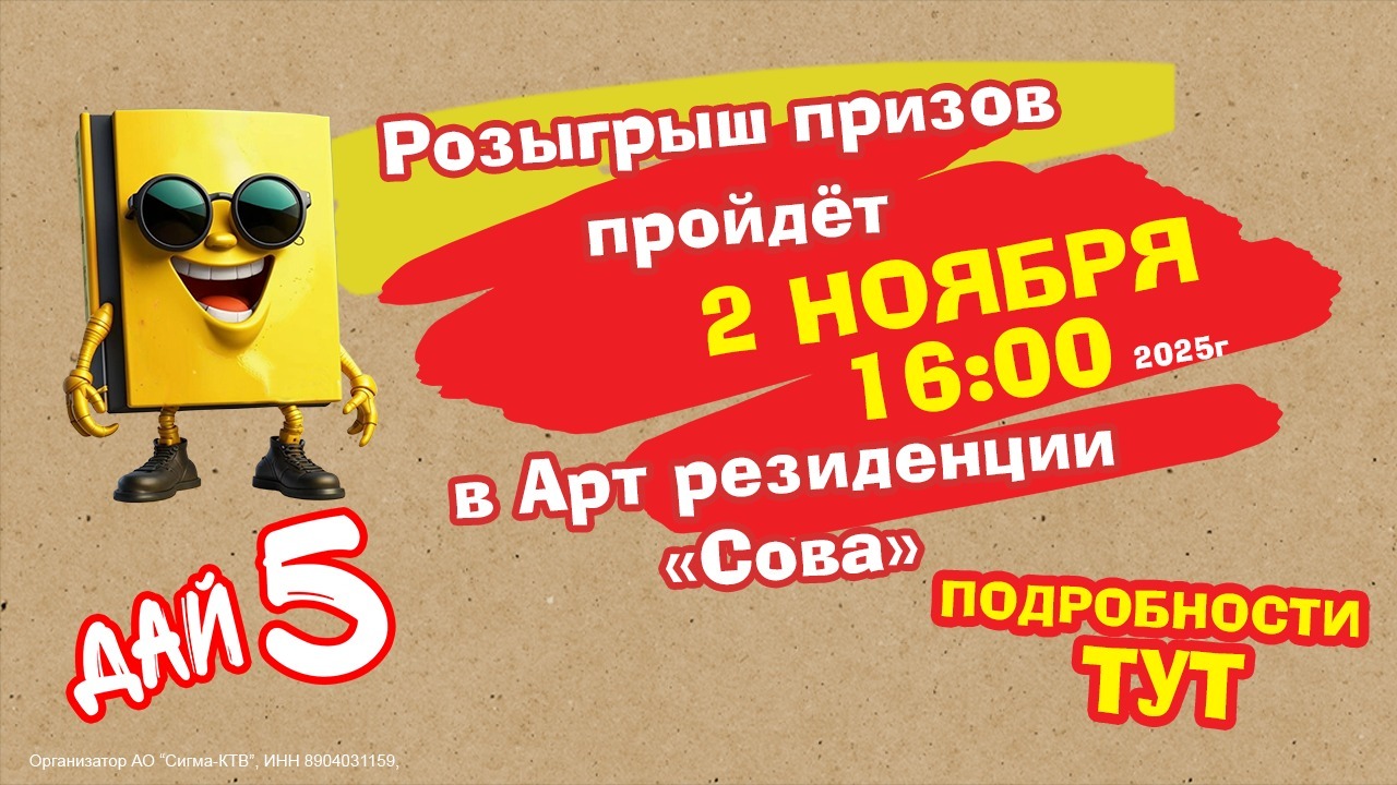 Дорогой друг! Мы рады сообщить, что наша акция "Дай"5 и розыгрыш призов состоится 2 ноября 2025г в 16:00, в арт-резиденции "Сова" по адресу ул. Мира, 2/1. Приходи заранее, чтобы зарегистрироваться, получить номер участника и пополнить лототрон своим именем. Будем ждать с 15 часов! Тебя ждет много сюрпризов! Не забудь фортуну и хорошее настроение!